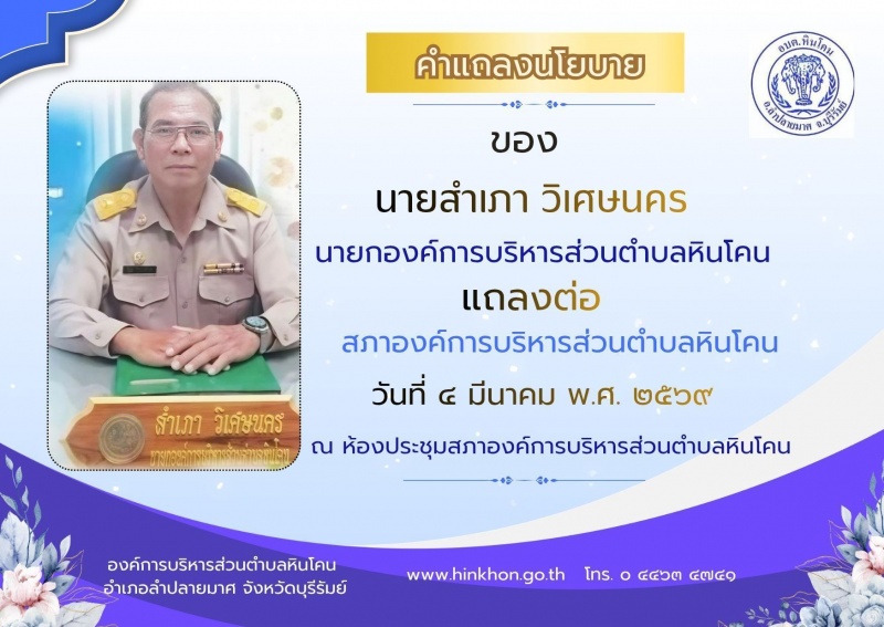วันที่ 4 มีนาคม 2569 : นายสำเภา วิเศษนคร นายกองค์การบริหารส่วนตำบลหินโคน แถลงนโยายต่อสภาองค์การยบริหารส่วนตำบ ... วันที่ 4 มีนาคม 2569 : นายนครรัชต์ สิงหะนาม ประธานสภาฯ ได้เปิดประชุมสภา อบต.หินโคน สมัยสามัญ สมัยแรก ประจำปี พ.ศ. 2569 ...